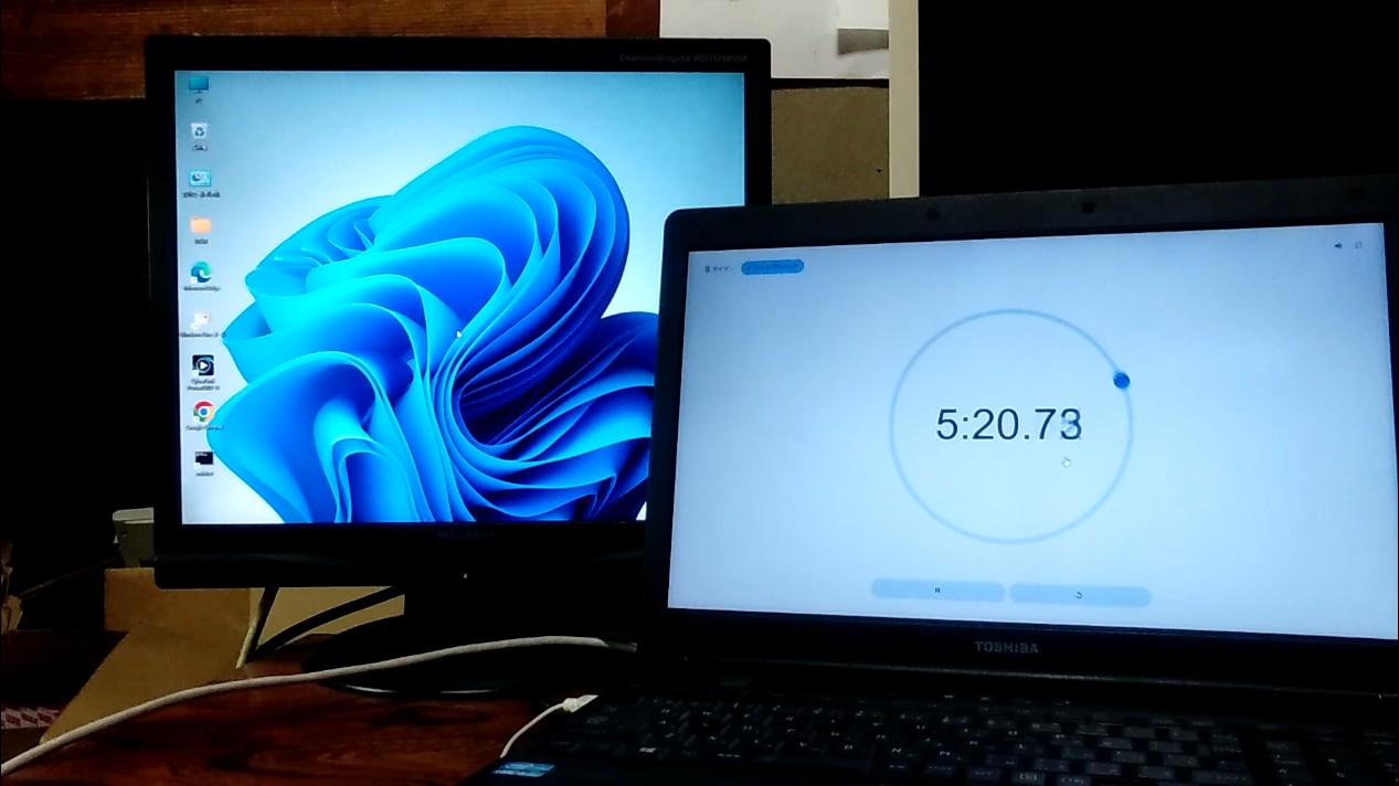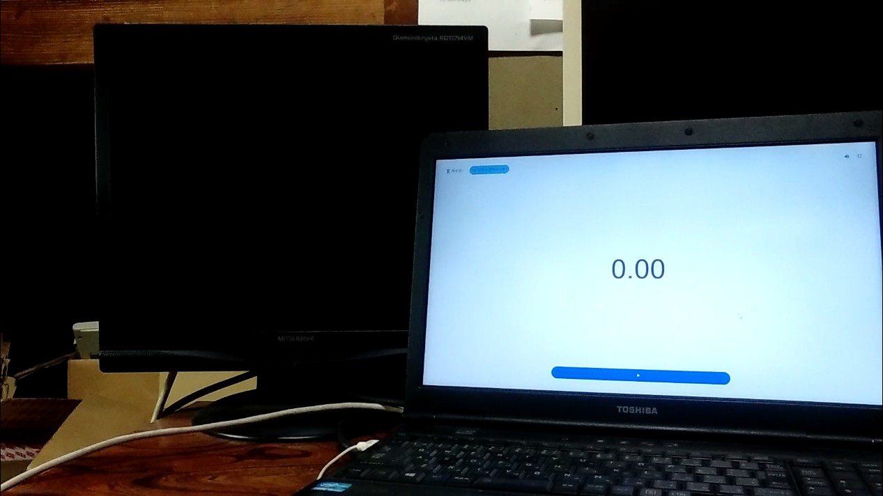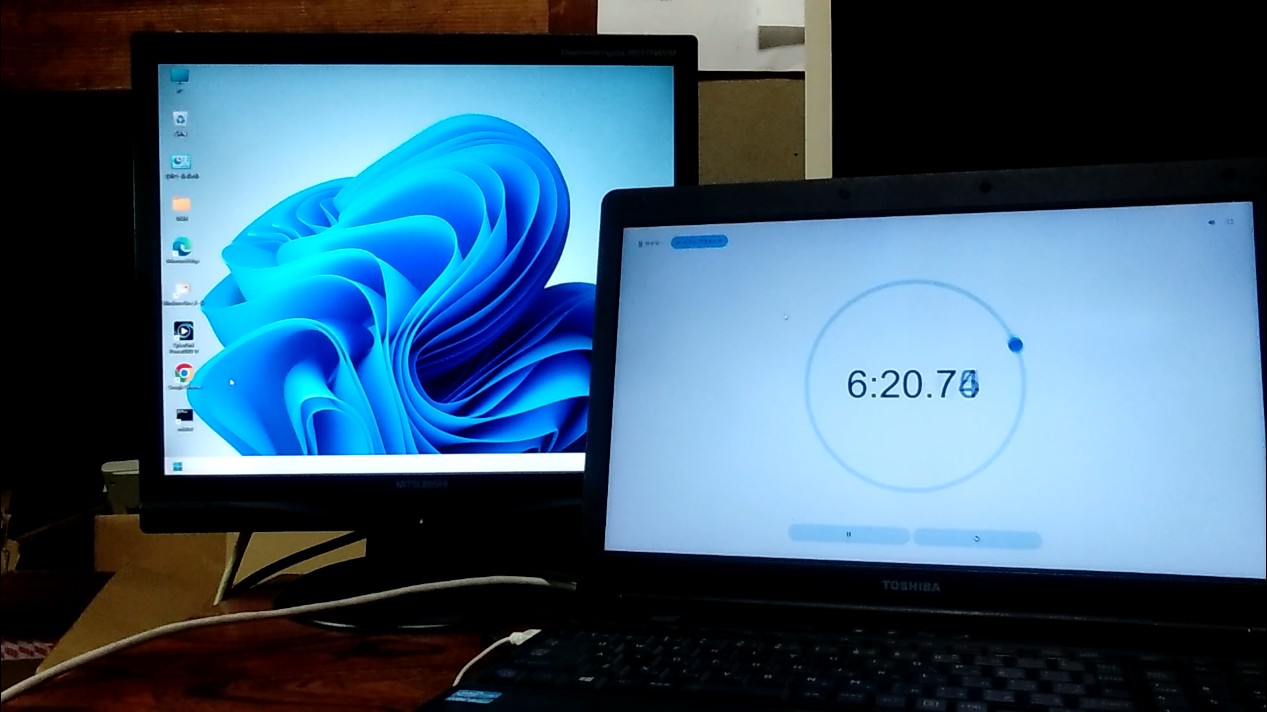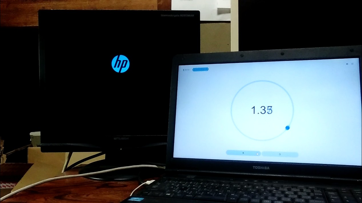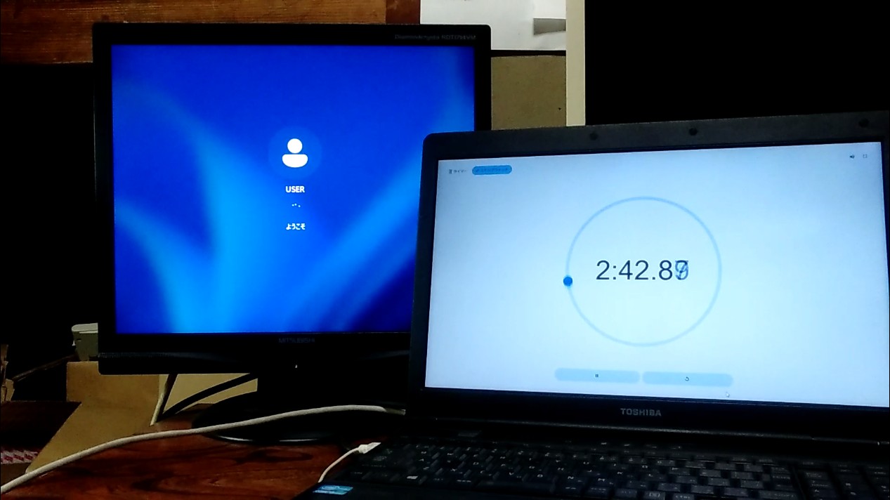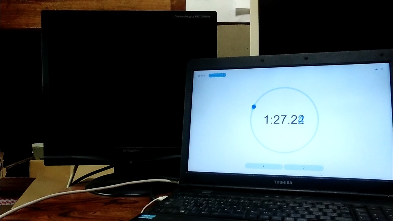 右側に置いたノートパソコンでストップウォッチアプリを起動させています。