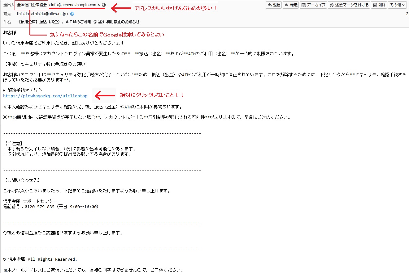 とにかく「使用を制限しました。もとに戻すにはこちらをクリック」なんてのはまず99%詐欺メールと思って間違いありませんでしょう。