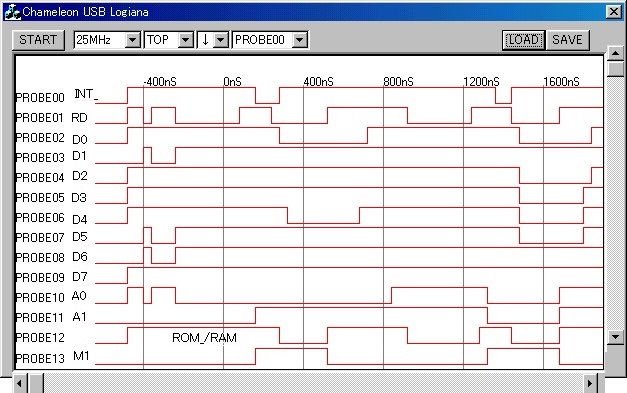 そこで[RUN]を押すとロジアナがINT信号をトリガにしてデータをキャッチし波形が表示されます。