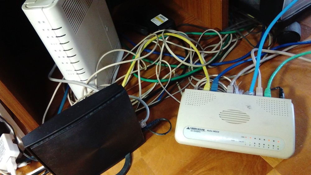 ルーターだけでは全然足りませんから右側のハブをつないでLANポートを増やしています。