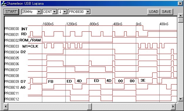 ロジアナで今までデータラインにしていたところから2本外してROM_/RAMセレクト信号とM1信号を観測することにしました。